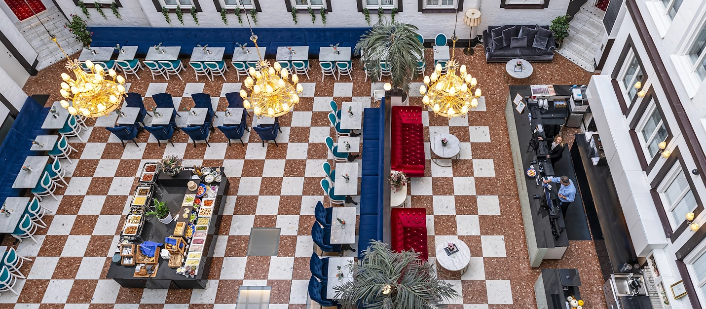 Vi har vår matsal i vår lobby där vår frukostbuffé serveras. Vi har även vår lobbybar bredvid receptionen som är öppen från 11.00–22.00.