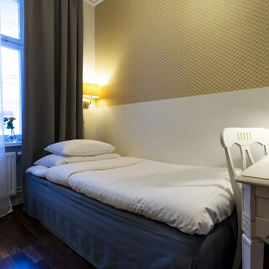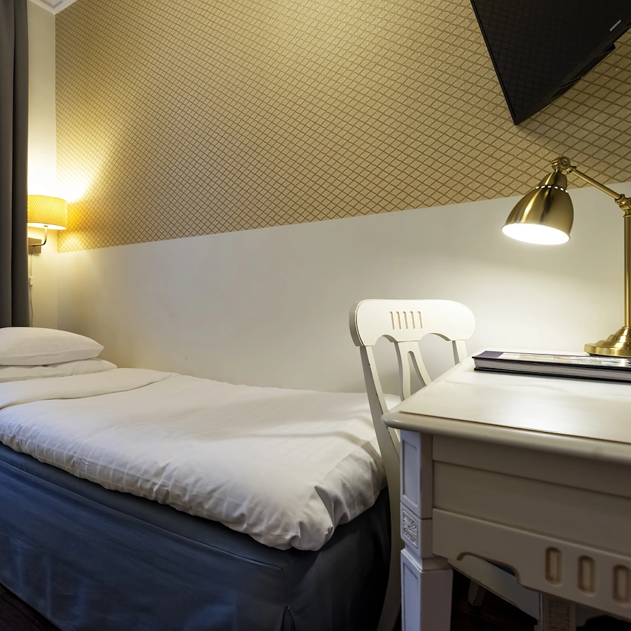 Våra ekonomi singelrum är utrustade med 90 sängar,  i rummet finns någon typ av garderob, tv och vattenkokare med kaffe och te. Helkaklat badrum med dusch. Dessa rum finns med utsikt mot innergården. Rummen är små och mysiga, ca 7-9 kvm.