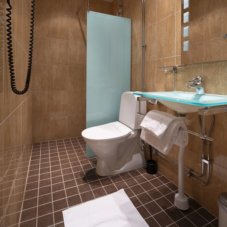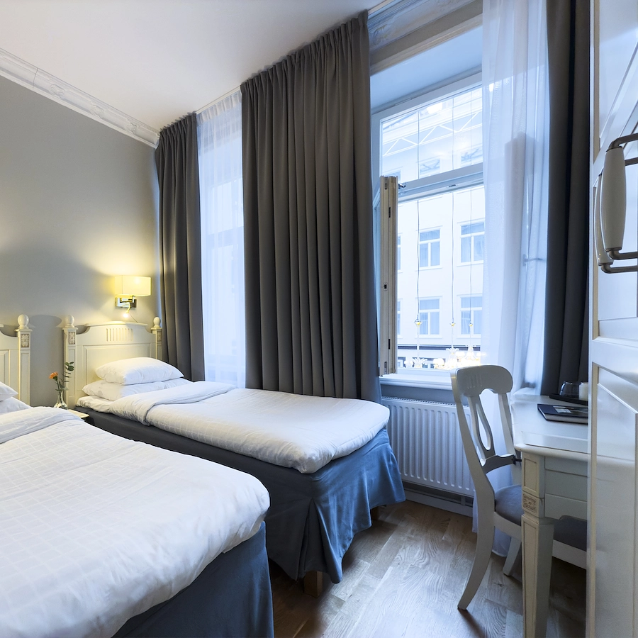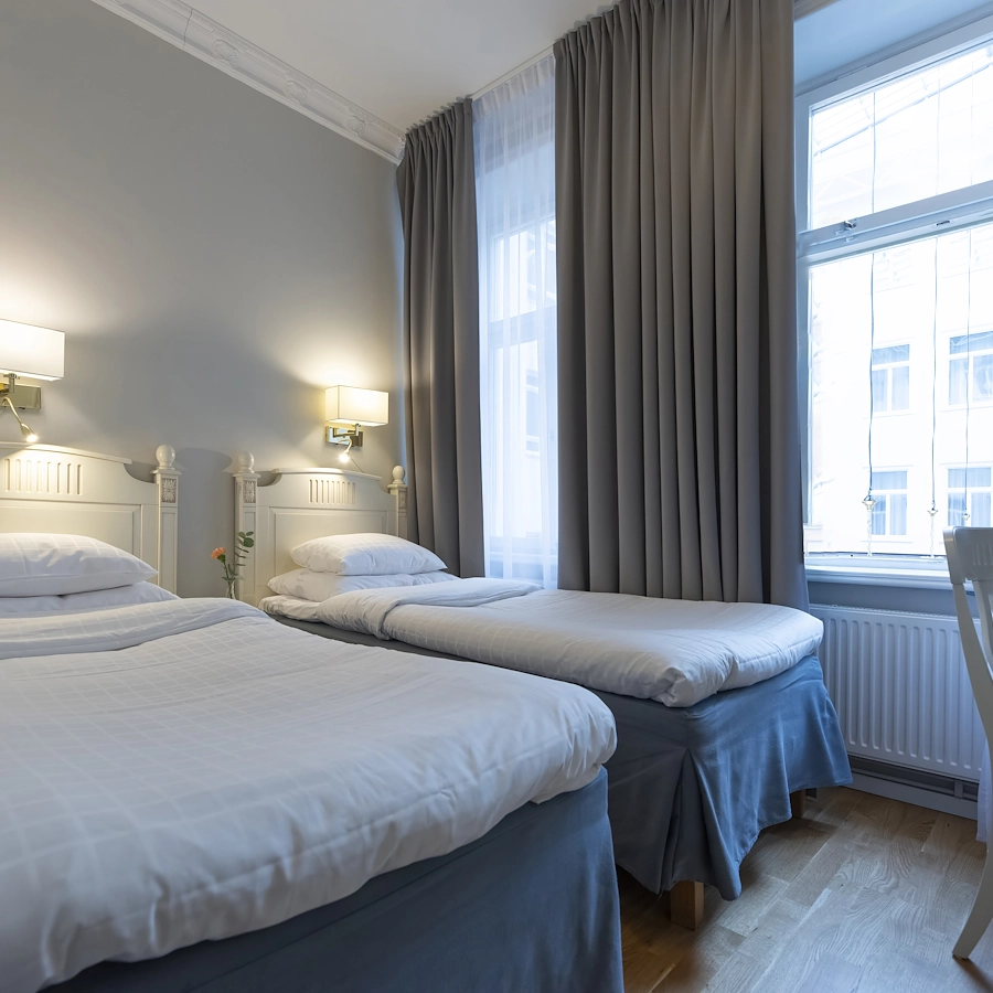 Våra twinrum är utrustade med 2 st 90 sängar som står isär, i rummet finns även ett skrivbord med stol, tv, garderob och vattenkokare med kaffe och te. Helkaklat badrum med dusch. Dessa rum finns med utsikt mot Drottninggatan eller mot innergården. Rummen är mellanstora, 10-15 kvm.